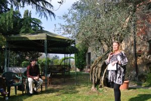 Det regnar vertikalt, det blåser alldeles för mycket, och det är två grader varmt. Klockan är elva och det är småmörkt redan nu. Det är inte roligt. Det är tungt att få något gjort. Bildspelet på datorn indikerar att inget arbete utförts på ett tag. Då kommer bilden av Titti upp. Det är en bild från förra våren. Hon står hos Lisa i trädgården intill hönsen och håller sitt ”examenstal”. Vi avslutar en retorikkurs på en vingård i Toscana.